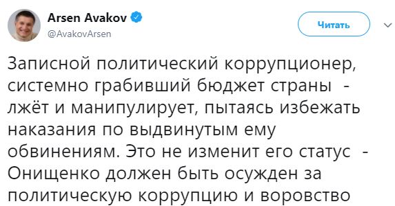 "Записной политический коррупционер, системно грабивший бюджет страны – лжет и манипулирует, пытаясь избежать наказания по выдвинутым ему обвинениям. Это не изменит его статус – Онищенко должен быть осужден за политическую коррупцию и воровство", - написал глава МВД.