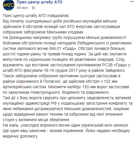 "На Донецком направлении грубо нарушая Минские договоренности боевики обстреляли позиции неподалеку Лебединского из реактивных систем залпового огня БМ-21 "Град". Обстрел начался около шести часов утра и продолжался более часа. За это время оккупанты выпустили по украинским позициям 40 реактивных снарядов", - говорится в сообщении.