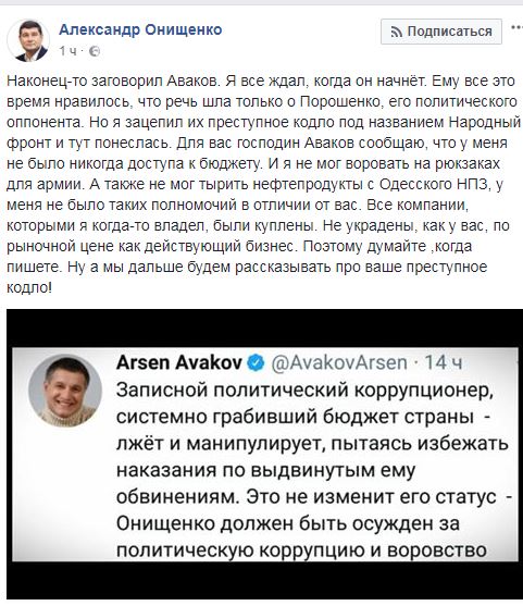 "Наконец-то заговорил Аваков. Я все ждал, когда он начнет. Ему все это время нравилось, что речь шла только о Порошенко, его политического оппонента. Но я зацепил их преступное кодло под названием Народный фронт и тут понеслась", - написал Онищенко на своей странице в ФБ.