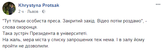"Здесь только личная пресса (Порошенко - Прим.Ред.). Закрытое мероприятие. Видео потом предоставим", - слова охранника", - сообщила Процак.