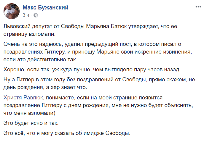 Блогер Макс Бужанский допускает, что Батюк могли взломать. Но говорит, что все без тени сомнения поверили в это. А значит "Свободу" воспринимают как партию, которая способна на подобные выходки.