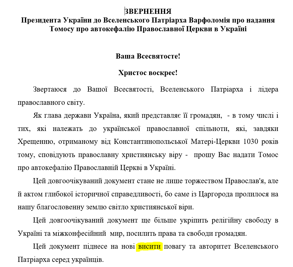 "Цей документ піднесе на нові висити (имелось в виду "висоти" - ред.) повагу та авторитет Вселенського Патріарха серед українців", - написал Порошенко Варфоломею.