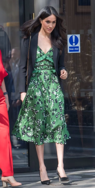 Поверх весеннего платья Маркл надела классический черный блейзер бренда Alexander McQueen, подчеркнув образ черными туфлями-лодочками и такой же сумочкой от Rouland Mouret.
