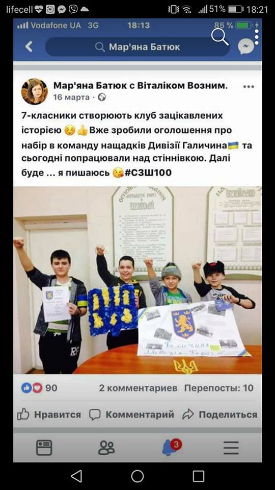 А вот ученики Марьяны дружно "зигуют" в честь дивизии "Галичина". Батюк пишет, что на картинке – семиклассники львовской школы №100, в которой преподает депутат от ВО "Свобода". По ее словам, они создают клуб интересующихся историей.