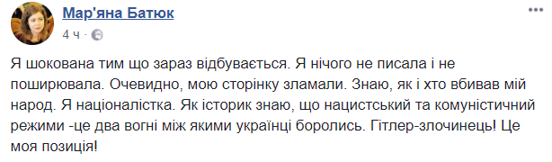 "Я шокирована тем, что сейчас происходит. Я ничего не писала и не распространяла. Очевидно, мою страницу взломали. Знаю, как и кто убивал мой народ. Я националистка. Как историк знаю, что нацистский и коммунистический режимы – это два огня между которыми украинцы боролись. Гитлер-преступник! Это моя позиция!"