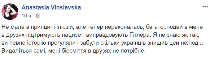 "У меня не было в принципе иллюзий, но теперь убедилась, многие у меня в друзьях поддерживают нацизм и оправдывают Гитлера. Я не знаю, как так, вы, вероятно, историю прогуляли и забыли, сколько украинцев уничтожил этот изверг ... Удалитесь сами, мне биомусора в друзьях не нужно", – пишет в Facebook львовская активистка и волонтер АТО Анастасия Винславская.