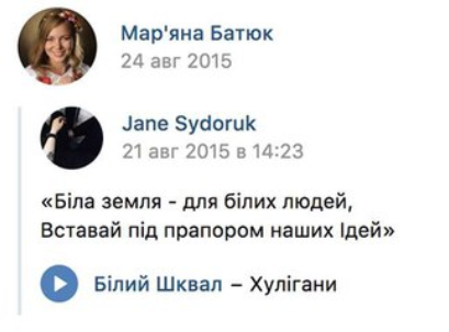 "Представители "Свободы" написали, что ее взломали. Ок. В наш век возможно все. Могут раз и сломать. Хотя зачем ломать, когда она самостоятельно все публикует? Человек в 21-м веке оставляет за собой цифровой след. Простым языком – удаляй, не удаляй, всё равно специалисты всё найдут. В общем оказывается, Марьяну Батюк, депутатшу Львовского совета от Свободы, ломали не раз. Её аккаунт ВКонтакте (забавно само его наличие) ломали как минимум 5 раз. В наличии "Марш Лювтваффе", "Воспоминания о Гитлере" и прочая лабуда".