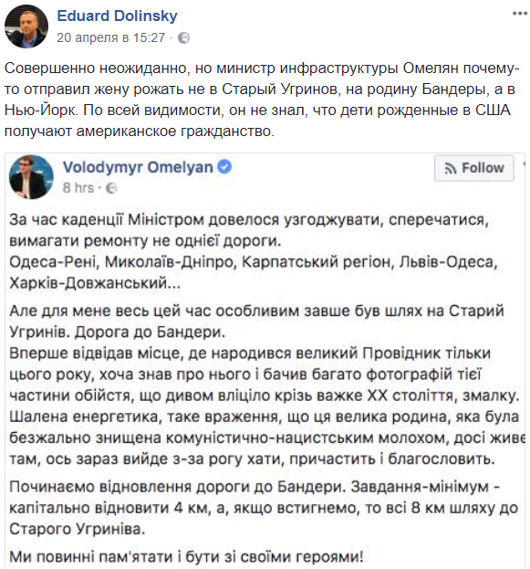 "Совершенно неожиданно, но министр инфраструктуры Омелян почему-то отправил жену рожать не в Старый Угринов, на родину Бандеры, а в Нью-Йорк. По всей видимости, он не знал, что дети, рожденные в США, получают американское гражданство".