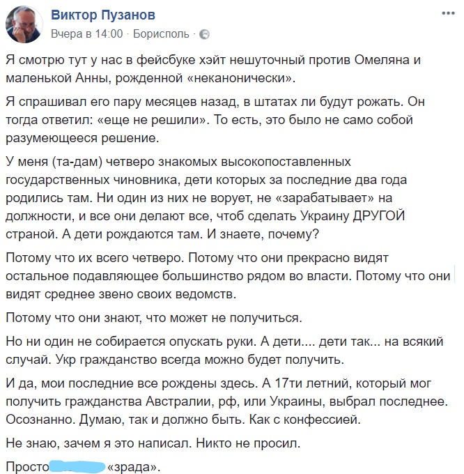 "У меня четверо знакомых высокопоставленных государственных чиновников, дети которых за последние два года родились там", – написал Пузанов в Facebook.
