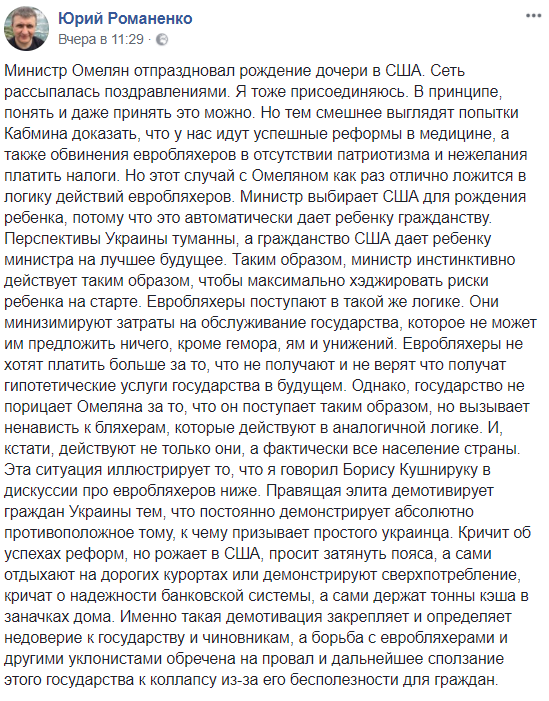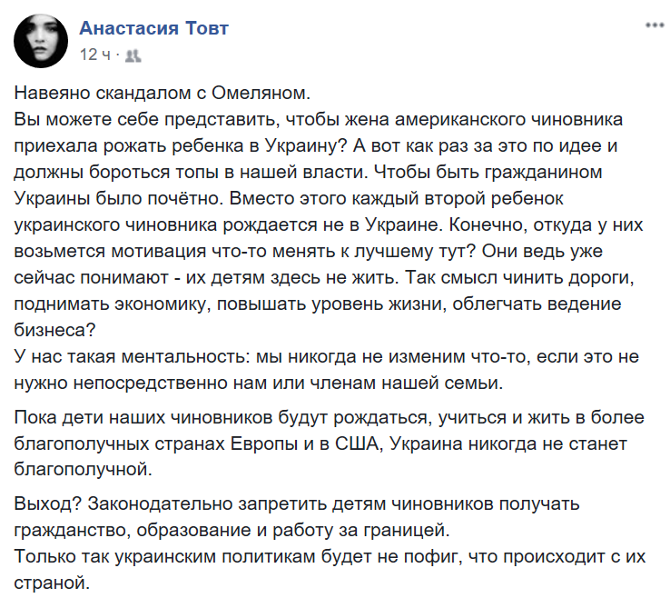 "Вы можете себе представить, чтобы жена американского чиновника приехала рожать ребенка в Украину? А вот как раз за это по идее и должны бороться топы в нашей власти. Чтобы быть гражданином Украины было почётно. Вместо этого каждый второй ребенок украинского чиновника рождается не в Украине. Конечно, откуда у них возьмется мотивация что-то менять к лучшему тут? Они ведь уже сейчас понимают - их детям здесь не жить. Так смысл чинить дороги, поднимать экономику, повышать уровень жизни, облегчать ведение бизнеса?