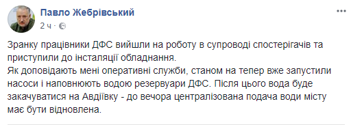 "Как сообщают мне оперативные службы, по состоянию "на теперь" уже запустили насосы и наполняют водой резервуары ДФС. После этого вода будет закачиваться на Авдеевку - к вечеру централизованная подача воды городу должна быть восстановлена", - добавил Жебривский.