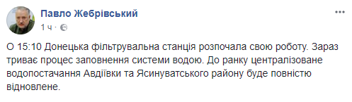 "В 15:10 ДФС начала свою работу. Сейчас идет процесс заполнения системы водой. К утру централизованное водоснабжение Авдеевки и Ясиноватского района будет полностью возобновлено", - заявил Жебривский.