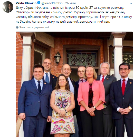 "Спасибо Христе Фриланд и всем министрам стран G7 за дружескую беседу. Обсудили оккупированный Крым и Донбасс. Украина воспринимают как неотъемлемую часть свободного мира, общего демократического пространства. Наши партнеры по G7 атаку на Украину видят как атаку на этот свободный, демократический мир", - написал министр.