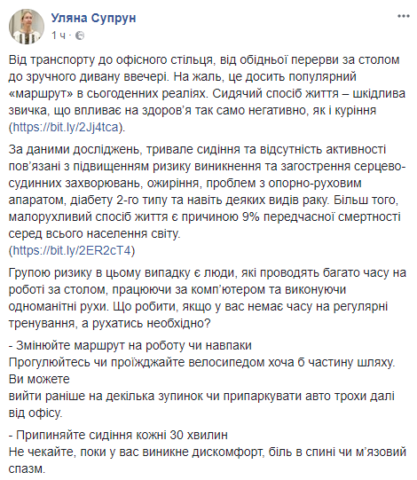 "От транспорта до офисного стула, от обеденного перерыва за столом в удобной дивана вечером. К сожалению, это довольно популярный "маршрут" в сегодняшних реалиях. Сидячий образ жизни - вредная привычка, влияющим на здоровье так же негативно, как и курение . Малоподвижный образ жизни является причиной 9% преждевременной смертности среди всего населения мира. Группой риска в этом случае есть люди, которые проводят много времени на работе за столом, работая за компьютером и выполняя однообразные движения", - написала в соцсети Ульяна Супрун.