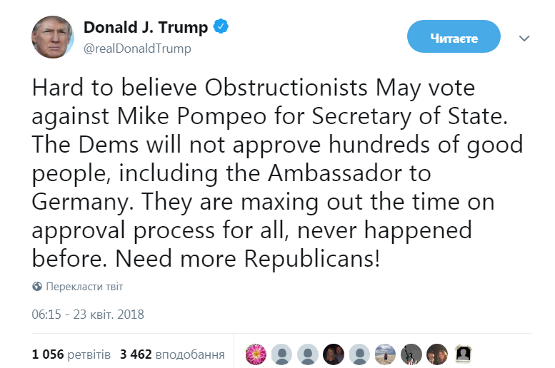 "Трудно поверить, что обструкционисты могут голосовать против (кандидатуры - Прим.Ред.) Майка Помпео в качестве госсекретаря. Демократы не одобряют сотни хороших людей, включая посла в Германии. Они максимизируют время на процесс утверждения для всех (решений, назначений - Прим.Ред.), которые не принимались раньше. Нужно больше республиканцев!", - написал президент США.