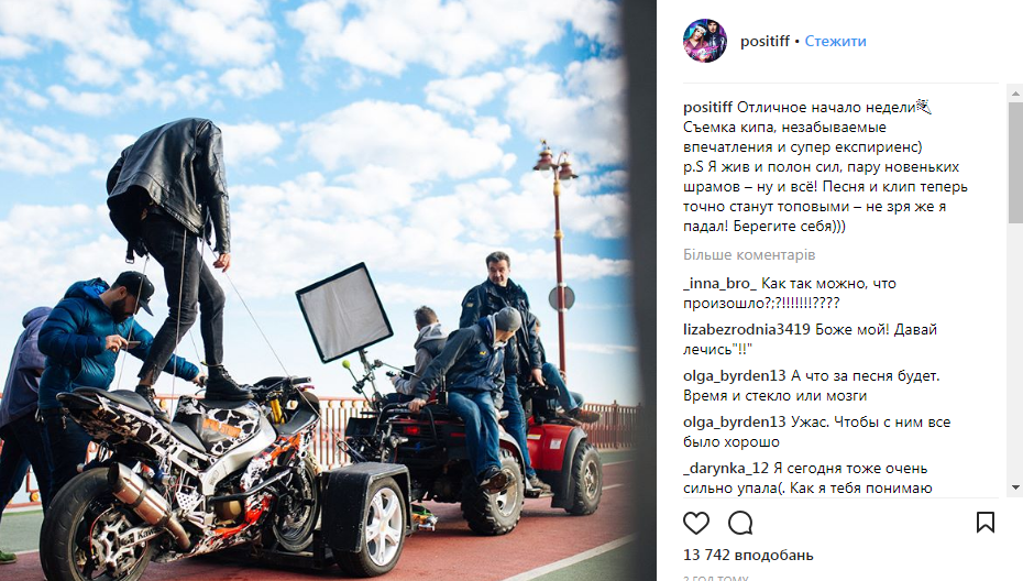 "Я жив и полон сил, несколько новеньких шрамов - ну и все! Песня и клип теперь точно станут топовыми - недаром же я падал!", - написал артист на своей странице в Instagram.