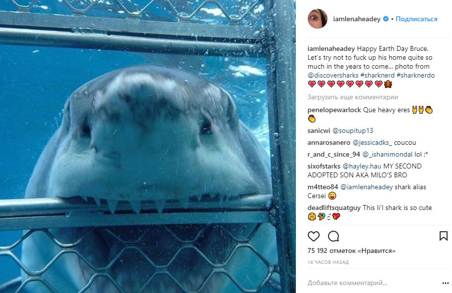 Лина Хиди (Серсея Ланнистер) в своем Instagram в основном делает посты на тему общечеловеческих ценностей, в частности, на днях она поздравила подписчиков с Днем Земли фотографией акулы, а ранее постила видео о войне в Сирии. Но иногда она выкладывает и свои фото.