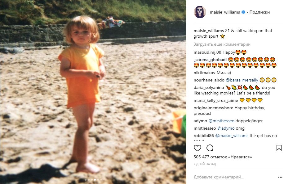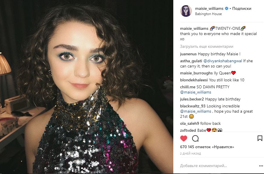 А на днях актрисе исполнился 21 год, и она показала себя в праздничном блестящем платье. Также Мэйси делилась своей детской фотографией.