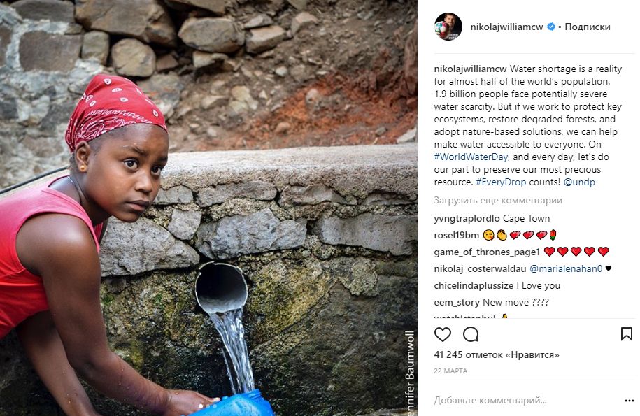 Много постов в его Instagram посвящены социальным проектом. Так, в последнем посте актер говорит о проблеме нехватки питьевой воды во многих регионах Земли.