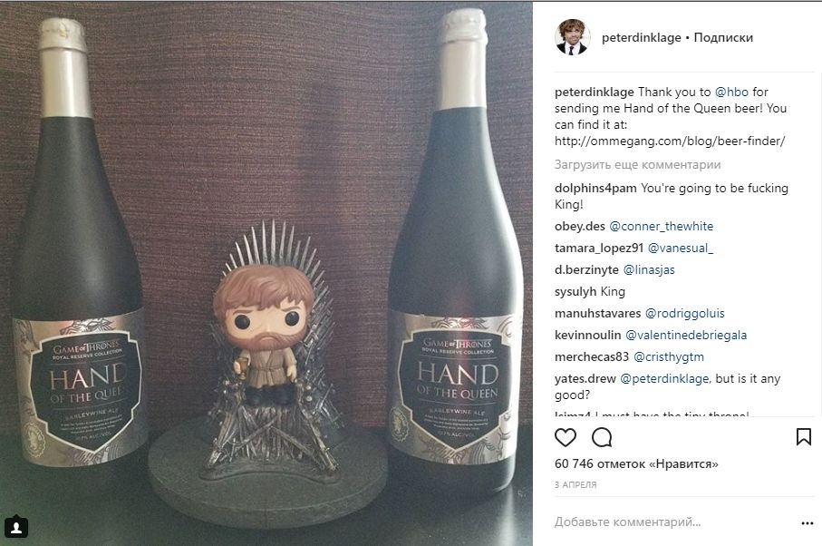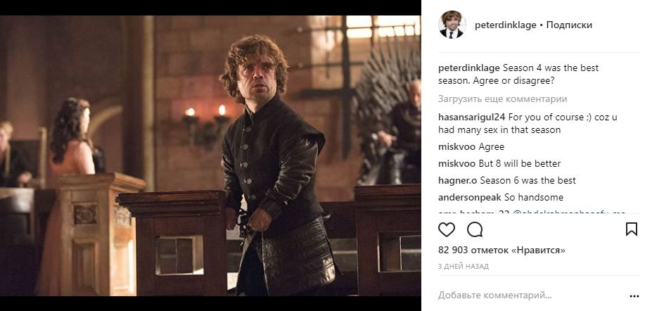 В инстаграме Питера Динклэйджа (Тирион Ланнистер) много фотографий с коллегами по сериалу со съемок и мероприятий. В годовщину премьеры "Игры престолов" он вспоминает съемки в предыдущих сезонах. Также он признался, что его любимый сезон – четвертый.