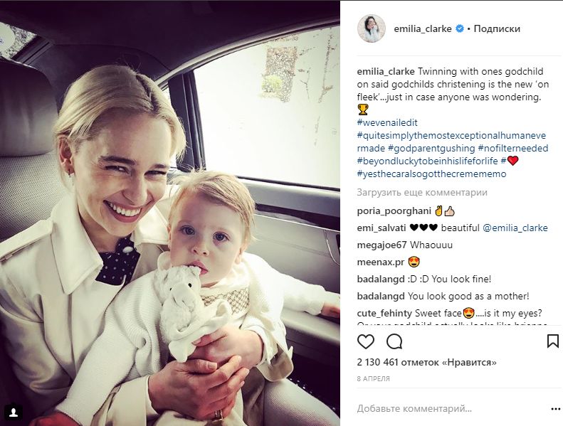 В своем Instagram Эмилия Кларк недавно выкладывала фото с вечеринки с друзьями, а также с новоиспеченным крестником.
