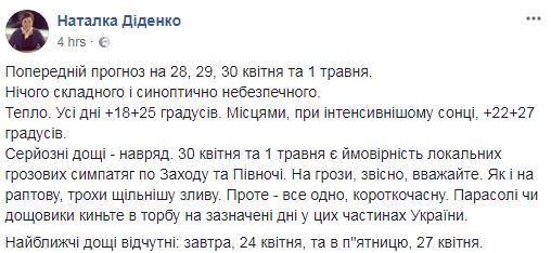 Об этом сообщила в Facebook синоптик Наталка Диденко.
