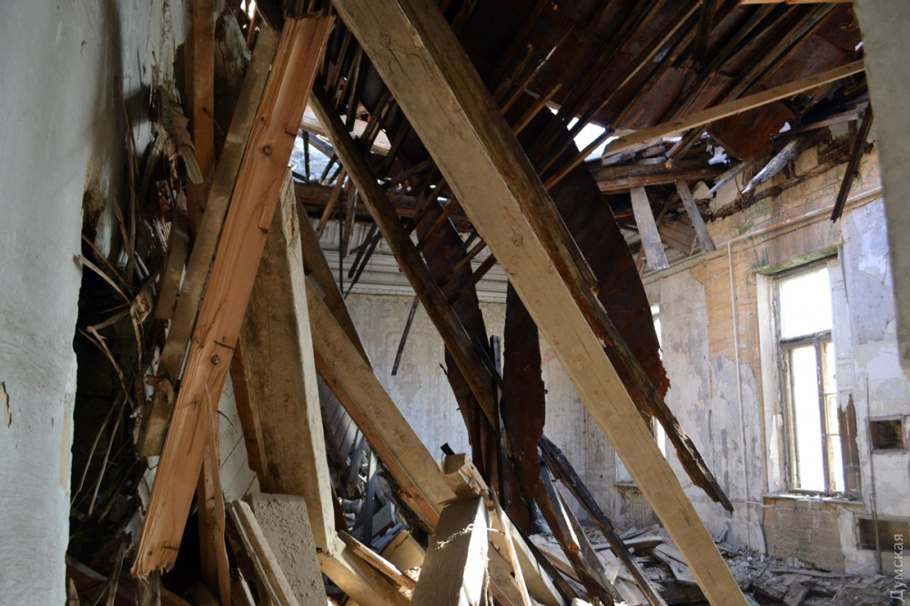 Недавно на ветхом памятнике архитектуры обрушился еще один участок крыши. Рухнувшие конструкции пробили межэтажное перекрытие, и теперь здание оказалось абсолютно беззащитным перед дождями, которые могут существенно ускорить его полное разрушение.