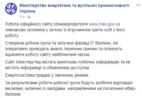 Министерство энергетики и угольной промышленности Украины создало рабочую группу, чтобы проанализировать причины взлома сайта.