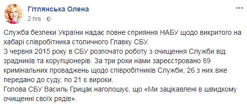 СБУ предоставляет полное содействие НАБУ касательно уличенного на взятке сотрудника столичного Главка СБУ. Об этом сообщает спикер СБУ Елена Гитлянская в соцсети Facebook.