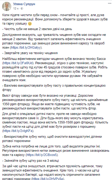 И.о. министра здравоохранения Ульяна Супрун продолжила серию санпросвета на своей страничке в соцсети рекомендациями о том, как правильно чистить зубы.