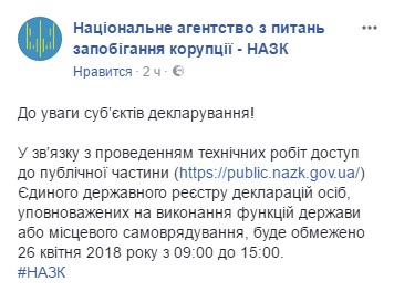 "Доступ к публичной части (https://public.nazk.gov.ua/) Единого государственного реестра деклараций лиц, уполномоченных на выполнение функций государства или местного самоуправления, будет ограничен с 26 апреля 2018 с 09:00 до 15:00", - говорится в заявлении.