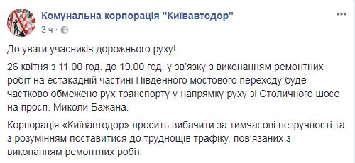 "26 апреля со 11:00 до 19:00 в связи с выполнением ремонтных работ на эстакадной части Южного мостового перехода будет частично ограничено движение транспорта в направлении движения со Столичного шоссе на проспект Николая Бажана", - говорится в сообщении.