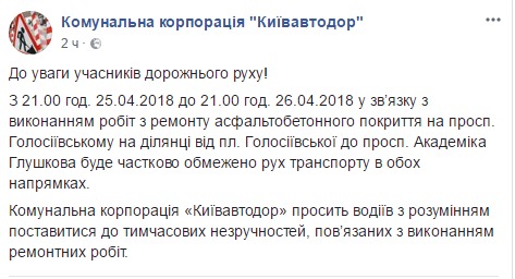 "С 21:00 25 апреля по 21:00 26 апреля в связи с ремонтом асфальтобетонного покрытия на ул. Голосеевской на участке от площади Голосеевской к просп. Академика Глушкова будет частично ограничено движение транспорта в обоих направлениях", - говорится в сообщении на странице мэрии в Facebook со ссылкой на коммунальную корпорацию "Киевавтодор".