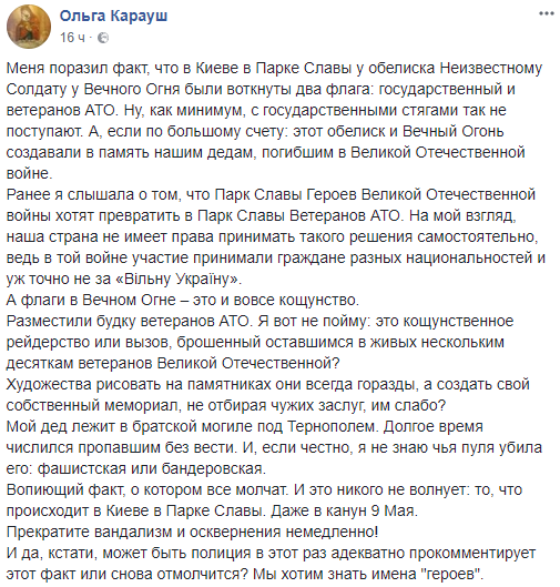 "Меня поразил факт, что в Киеве в Парке Славы у обелиска Неизвестному Солдату у Вечного Огня были воткнуты два флага: государственный и ветеранов АТО. Ну, как минимум, с государственными стягами так не поступают", - написала она и высказала пожелание, что полиция разберется в этом.