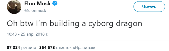 Американский миллиардер Илон Маск заявил, что занят в новом проекте по строительству дракона-киборга. Об этом он написал в своем микроблоге в Twitter.