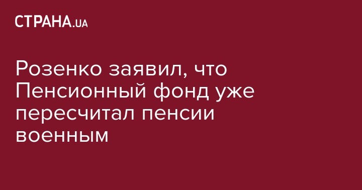 "Могу сообщить приятную новость для наших военных пенсионеров - сегодня фактически Пенсионный фонд Украины завершил пересчет пенсий военных пенсионеров. То есть мы выполнили данное обещание, что к 1 мая все пенсии военным будут пересчитаны", - заявил чиновник.
