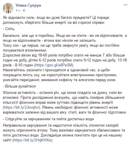 Ульяна Супрун в Facebook уверяет, что ее советы помогут сохранять больше энергии на все полезные дела.