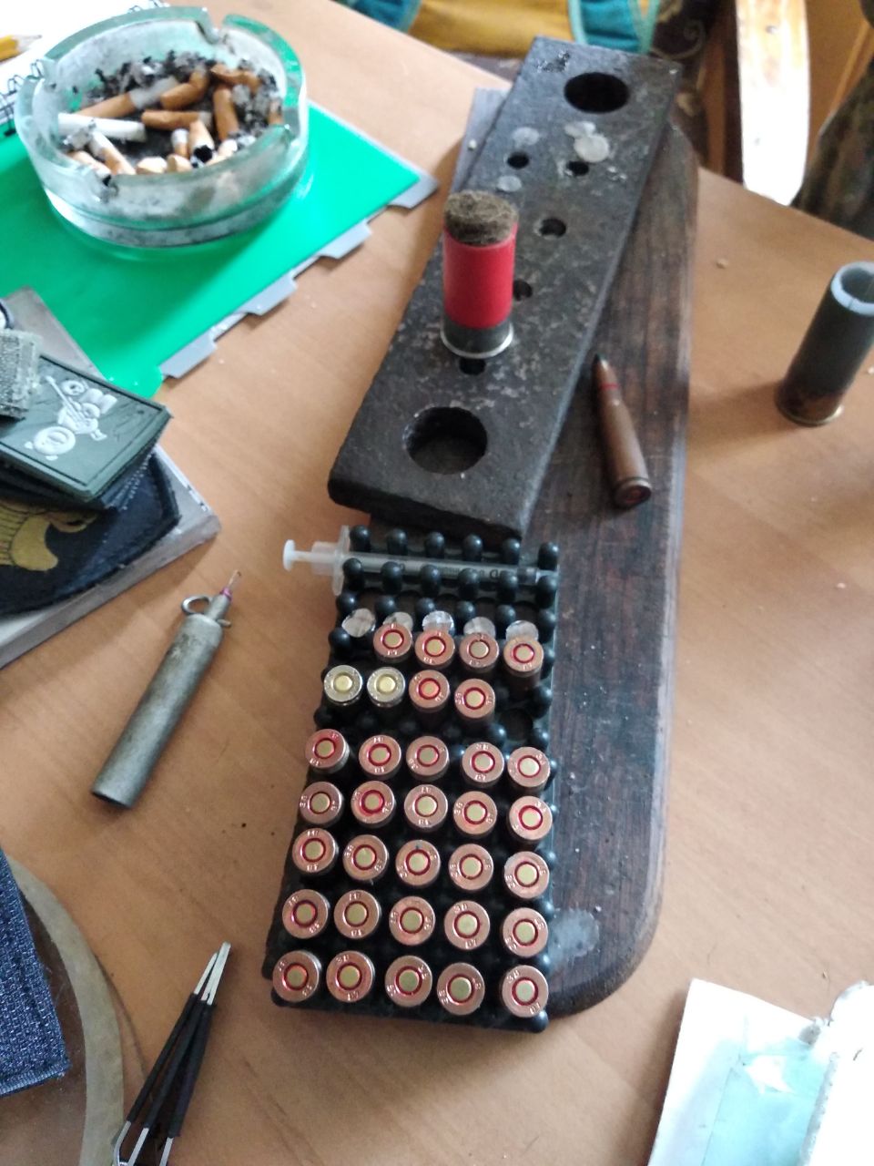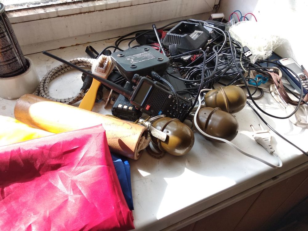 Во время обыска было обнаружено шесть гранат с запалами, мина, взрыватель к мине, два пистолета, патроны к ним, боевые ножи и амуниция.