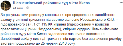 Шевченковский районный суд Киева продлил до 25 июня меру пресечения в виде содержания под стражей Юрия Россошанского, которого подозревают в убийстве юриста Ирины Ноздровской. Об этом суд сообщил на своей странице в Facebook.
