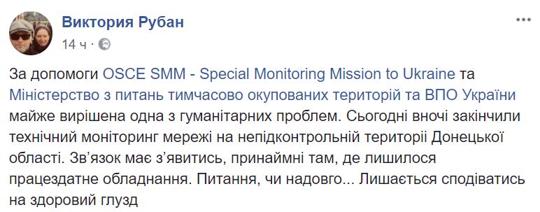 "С помощью Специальной мониторинговой миссии ОБСЕ и Министерству по вопросам временно оккупированных территорий почти решена одна из гуманитарных проблем. Сегодня ночью закончили технический мониторинг сети на неподконтрольной территории Донецкой области. Связь должна появиться, по крайней мере там, где осталось трудоспособное оборудование. Вопрос, надолго ... Остается надеяться на здравый смысл", - написала Рубан.