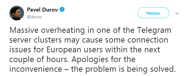 "Серьезный перегрев одной из групп серверов Telegram может привести к проблемам с подключением к мессенджеру у европейских пользователей в течение следующих нескольких часов", – написал он.