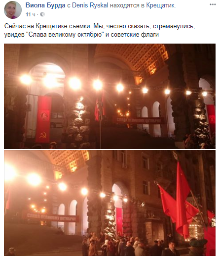 Как выяснилось, красные флаги и транспоранты оказались декорациями к фильму о Василии Стусе "Птах душі", съемки которого начались в Киеве.