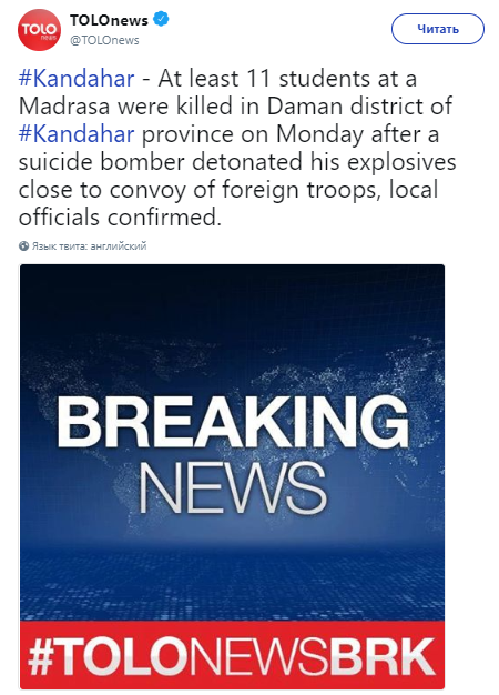 Напомним, что до этого два взрыва произошли в столице Афганистана, Кабуле, где 30 апреля взорвал себя террорист-смертник на мотоцикле. После первого взрыва, когда на место происшествия прибыли медики и журналисты, произошел второй. Смертник находился среди группы журналистов. В результате атаки погибли семь журналистов и оператор.