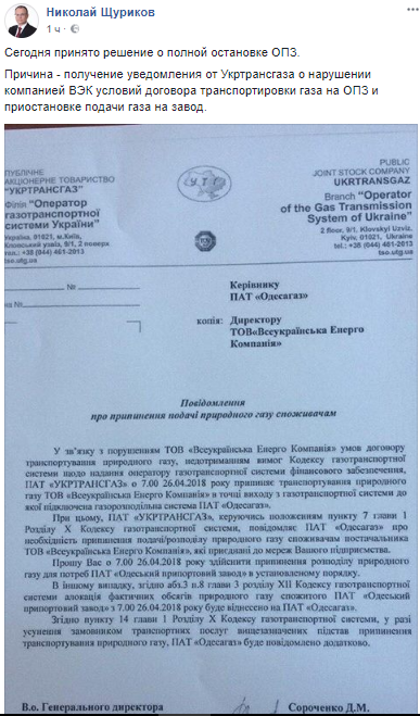 "Сегодня принято решение о полном прекращении деятельности ОПЗ. Причина - получение сообщения от Укртрансгаза о нарушении компанией "ПЭК" условий договора на поставку газа на завод и приостановления подачи газа", - сообщил Щуриков.