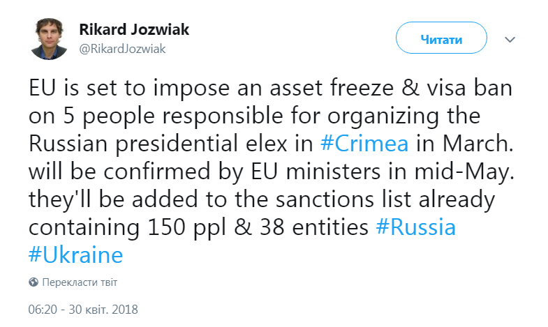 "ЕС намерен заморозить активы и запретить визы для пяти человек, которые ответственны за организацию выборов президента России в Крыму в марте. Санкции министры ЕС утвердят в середине мая", - сообщил журналист "Радио Свобода".
