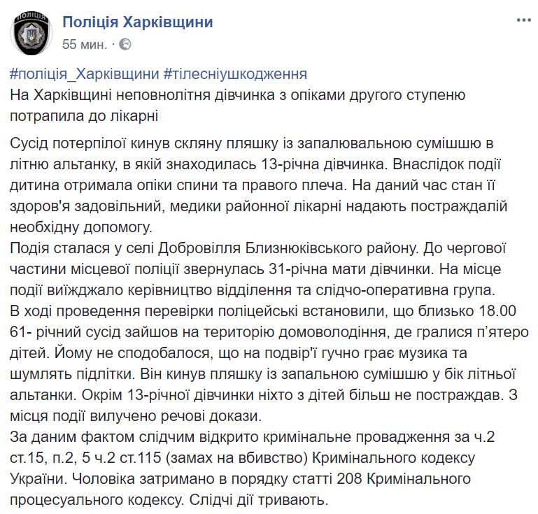 В Харьковской области житель села Доброволье (Близнюковский район) бросил бутылку с зажигательной смесью в беседку, где находилась 13-летняя девочка. Об этом сообщает отдел коммуникаций ГУ Нацполиции в Харьковской области в Facebook.