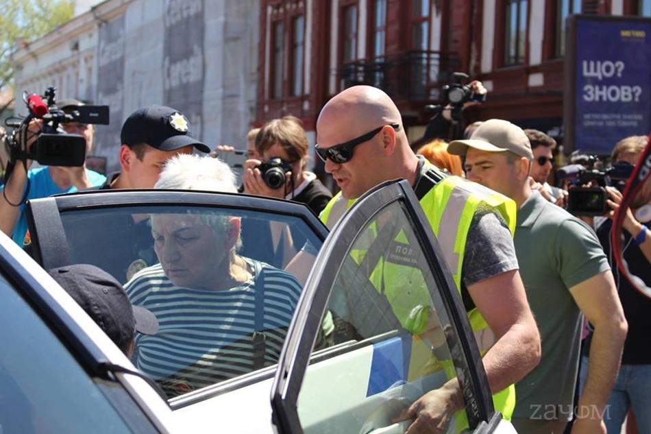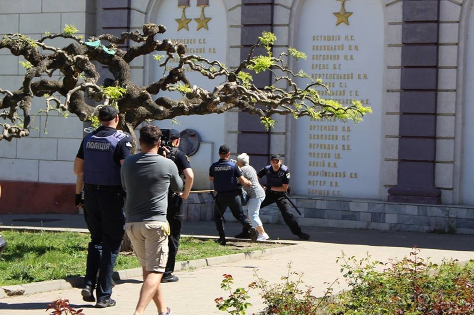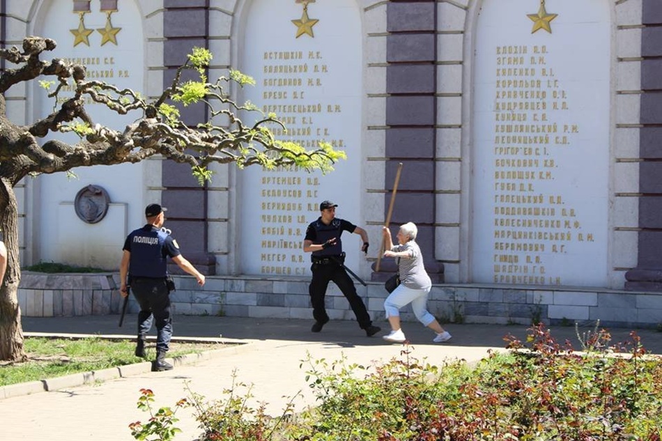 По предварительной информации, пожилая участница первомайского митинга ударила одного из националистов древком от флага по голове. За это ее попыталась задержать полиция, но получила неожиданный отпор.
