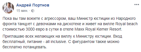 "Пока вы там воюете с агрессором, ваш Министр юстиции из Народного фронта танцует с девочками на дискотеке и живет на вилле Royal beach стоимостью 3000 евро в сутки в отеле Maxx Royal Kemer Resort.