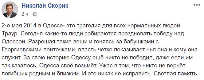 Народный депутат от "Оппозиционного блока" Николай Скорик, некогда возглавлявший Одесскую область, считает, что "Одесса свое возьмет": "2-е мая 2014 в Одессе- это трагедия для всех нормальных людей. Траур. Сегодня какие-то люди собираются праздновать победу над Одессой. Разрешая такие вещи и гоняясь за бабушками с Георгиевскими ленточками, власть четко показывает чья она и кому она служит. За свою историю Одессу ещё никто не победил, даже если им так казалось. Одесса своё возьмёт. Ужас в том, что никто не вернёт погибших родным и близким. И это никак не исправить. Светлая память".