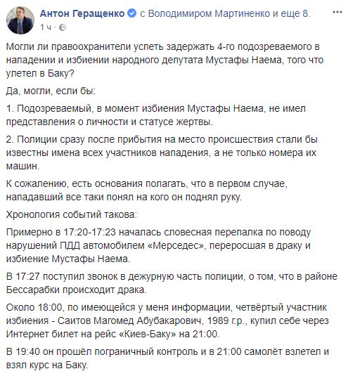 Нардеп, приближенный к главе МВД, Антон Геращенко сегодня отметился в Facebook, но писал о расследовании избиения депутата Мустафы Найема.